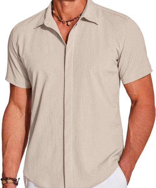 Men’s Casual Short Sleeve Button Down Summer Beach Shirt Lightweight Textured Wrinkle Free Stretch Shirts